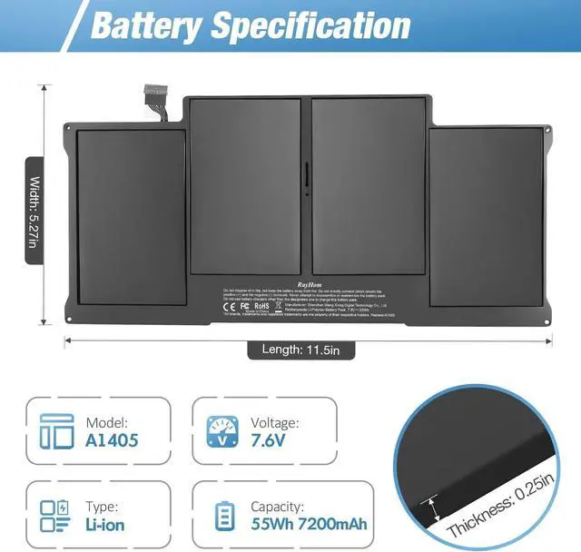 RayHom A1466 Laptop Replacement Battery for MacBook Air 13 inch A1466 (Mid 2012, Mid 2013, Early 2014, Early 2015, 2017) A1369(Late 2010, Mid 2011 Version) High Performance 7200mAh fits A1496 A1405 A1377