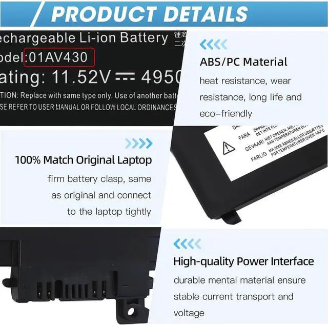 20 years of expert production: Our 01AV430 Laptop Battery offers compatibility with the original 01AV430 Lenovo Battery, features American high-end battery chips, and has a low-power design for extended battery life. It includes built-in circuit protection for steady performance and provides protections against overcharging, over-discharging, and short-circuiting