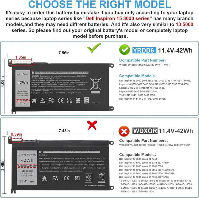 Compatible Laptop Model: YRDD6 Laptop Battery for Dell Inspiron 14 3000 Series 3493; Replacement for Dell Inspiron 14 5000 series 5480 5481 5482 5485 5491 5493 2-in-1; Replacement for Dell Inspiron 15 3000 Series 3501 3582 3583 3584 3593; Replacement for Dell Inspiron 15 5000 Series 5584 5585 5590 5591 5593 5594 5598; Replacement for Dell Inspiron 15 7000 Series 7586; Replacement for Dell Inspiron 17 3000 Series 3793; Replacement for Dell Vostro 5481 5581 5490 5590 3491