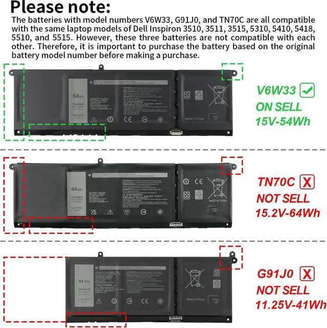 Note: There are 3 batteries (41Wh-G91J0, 54Wh-V6W33 and 64Wh-TN70C) for the above laptops. Please choose which one you are going to replace, based on the original battery of your laptop