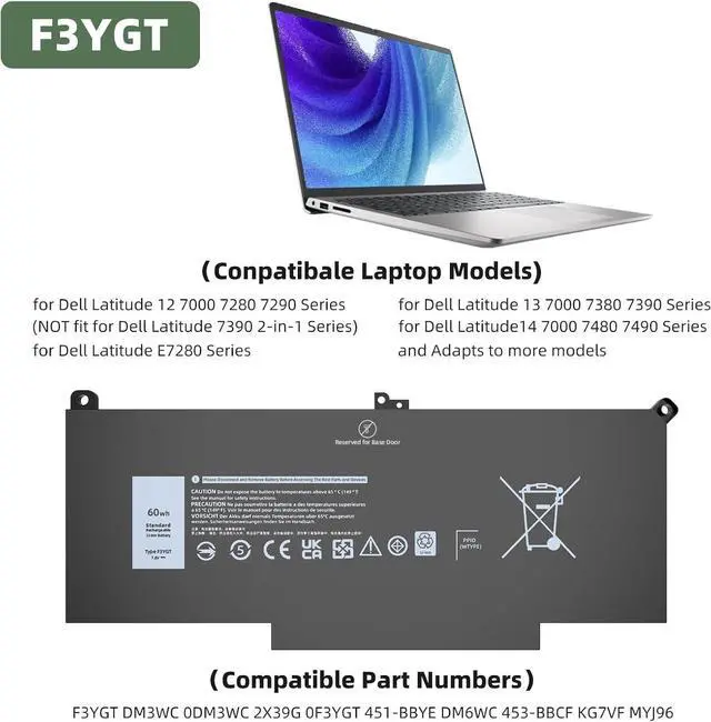 Compatible Laptop Models: F3YGT Battery Replacement for Dell Latitude 12 7000 7280 7290 Series, 13 7000 7380 7390 Series, 14 7000 7480 7490 Series, E7280 Series, E7380 Series, E7480 Series, E7290 Series, E7390 Series, E7490 Series. P28S P28S001 P73G P73G002