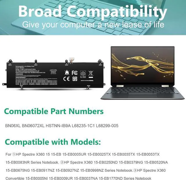 Compatible Part Number: HP Spectre X360 Battery Replacement BN06XL BNO6XL BN06072XL HSTNN-IB9A L68235-1C1 L68299-005