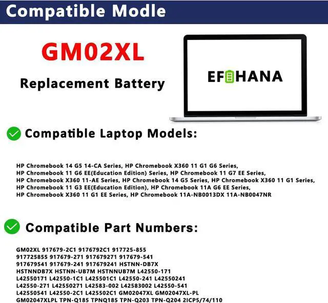 Compatible Part NumberFit for GM02XL 917679-2C1 9176792C1 917725-855 917725855 917679-271 917679271 917679-541 917679541 917679-241 917679241 HSTNN-DB7X HSTNNDB7X HSTNN-UB7M HSTNNUB7M L42550-171 L42550171 L42550-1C1 L425501C1 L42550-241 L42550241 L42550-271 L42550271 L42583-002 L42583002 L42550-541 L42550541 L42550-2C1 L425502C1 GM02047XL GM02047XL-PL GM02047XLPL TPN-Q185 TPNQ185 TPN-Q203 TPN-Q204 2ICP5/74/110