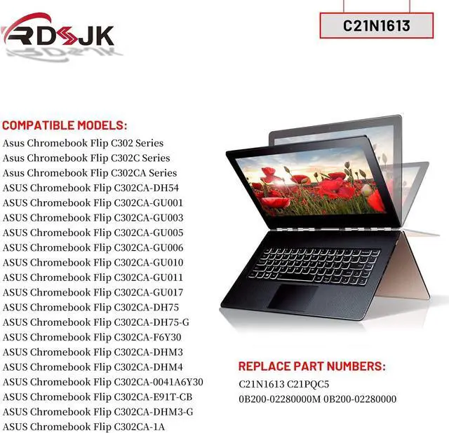 Compatible Models: Fit for Asus Chromebook Flip C302C C302CA C302CA-1A C302SA C302CA-DHM4 C302CA-DHM3 Series; Fit for ASUS Chromebook Flip C302CA-GU001 C302CA-GU003 C302CA-GU005 C302CA-GU006 C302CA-GU010 C302CA-GU011 C302CA-GU017; Fit for ASUS Chromebook Flip C302CA-DH75 C302CA-DH75-G Series; Fit for ASUS Chromebook Flip C302CA-F6Y30 C302CA-DHM3 C302CA-DHM3-G; Fit for ASUS Chromebook Flip C302CA-0041A6Y30 C302CA-E91T-CB
