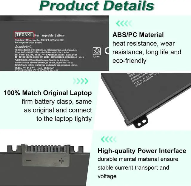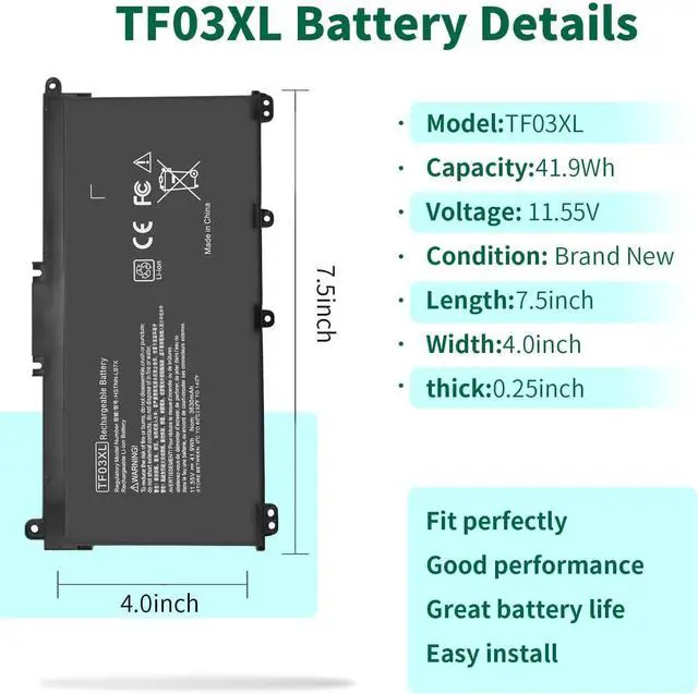 Compatible Models: TF03XL Battery for HP 920046-121 920046-421 920046-541 920070-855 HSTNN-IB7Y HSTNN-LB7J HSTNN-LB7X HSTNN-UB7J TF03041XL TF03XL TPN-Q188 TPN-Q189 TPN-Q190 TPN-Q191 TPN-Q192 TPN-Q19617-AR Series 17-AR007CA 17-AR050WM15-CC005NG 15-CC005NI 15-CC005NK 15-CC005NL 15-CC005NM 15-CC005NO 15- CC005TU 15-CC005TX 15-CC005UR 15-CC006NC 15-CC006NG 15-CC006NI 15-CC006NK 15-CC006NL 15-CC006NO 15-CC006NX 15-CC006TX 15- CC006UR 15-CC007NC 15-CC007NG 15-CC007NT 15-CC007NX 15-CC007TX 15-CC007UR 15-CC008NC 15-CC008NO 15-CC008NT 15-CC008NX