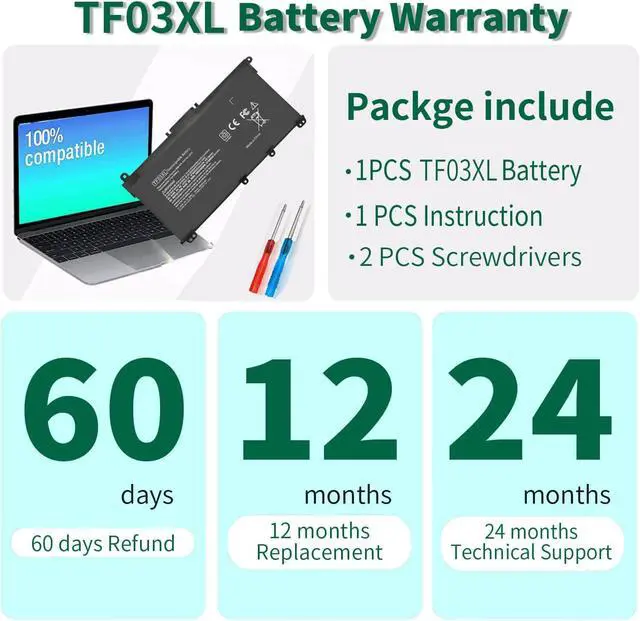 What You Get: TF03XL Battery, User Manual for TF03XL Battery HP Pavilion X360. We offer a 60-day return policy. For assistance with the TF03XL Battery, please visit our product detail page.