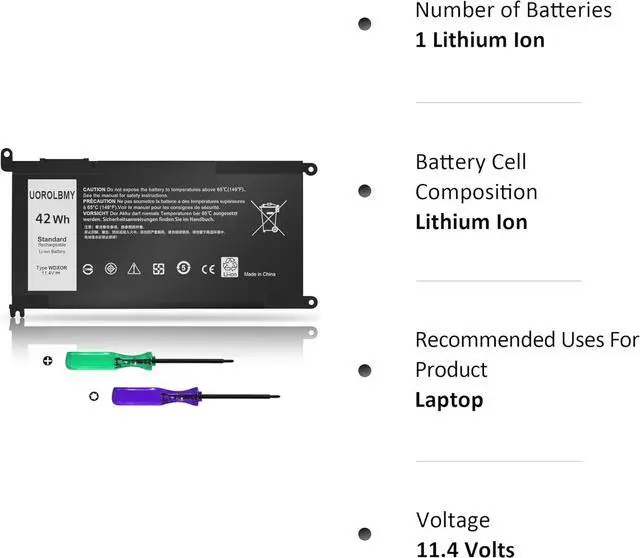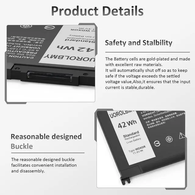 42Wh WDX0R notebook batteries have passed strict intelligent detection, such as short circuit protection, over voltage protection, discharge protection, over current protection, which is very important for batterys use cycle and safety. All batteries are equipped with high quality material to ensure good performance. CE, FCC, RoHS certificated