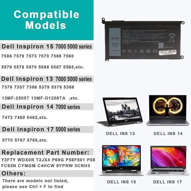 Compatible with Dell Laptop Battery WDX0R P69G001 3CRH3 FC92N T2JX4 C4HCW Y3F7Y Battery 3-cell 42WH 11.4 v Li-on WDX0R Battery Inspiron 15 5570 Battery Inspiron 13-7378 battery Inspiron 15-7579 battery Inspiron 5579 5379 Battery Inspiron 5567 Battery Inspiron 13 7000 Battery Inspiron p69g Battery Inspiron 7573 7560 Battery