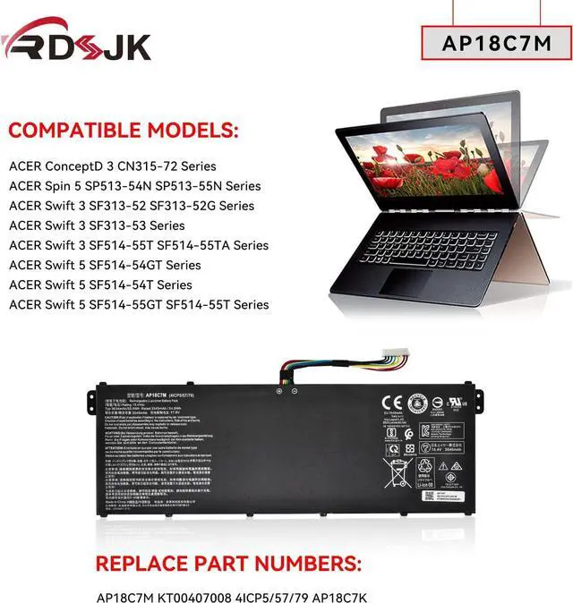 Compatible Models: ACER ConceptD 3 CN315-72 Series; ACER Spin 5 SP513-54N SP513-55N Series; ACER Swift 3 SF313-52 SF313-52G Series; ACER Swift 3 SF313-53 SF313-53G Series; ACER Swift 3 SF514-55T SF514-55TA Series; ACER Swift 5 SF514-54GT Series; ACER Swift 5 SF514-54T Series; ACER Swift 5 SF514-55GT SF514-55T Series; ACER Swift 3 SF316-51 Series; ACER Swift 5 SF514-56T Series; ACER Swift X SFX16-52G Series; ACER Aspire Vero AV14-51 Series; ACER TravelMate Spin P4 P414RN-51 Series; ACER TravelMate Spin P4 TMP414RN-51 Series; ACER ConceptD 3 CN315-72 CN315-72G Series; ACER ConceptD 3 CN316-73P CN316-73G Series; ACER ConceptD 3 Ezel CC315-72 CC315-72P Series