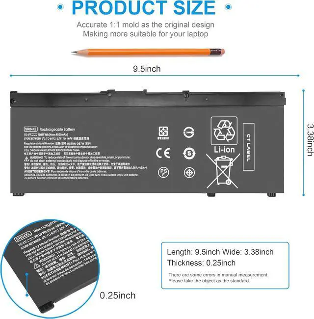 SECURITY: The SR04XL laptop batteries have passed strict intelligent detection, such as short circuit protection, over voltage protection, discharge protection, over current protection, which is very important for batterys use cycle and safety. All batteries are equipped with high quality material to ensure good performance. CE, FCC, RoHS certificated.