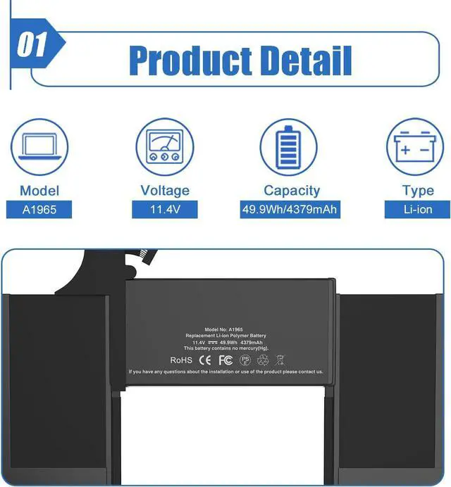• Basic DetailsItem Model: A1965; Battery Type: Li-ion; Voltage: 11.4V; Capacity:49.9Wh/4379mAh; Battery Color: Black.
