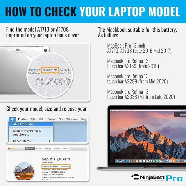 COMPATIBLE MODELS: MacBook Pro 13-inch A1713 A1708 (Late 2016 Mid 2017) Version MLL42LL/A MPXQ2LL/A MLL42CH/A MLUQ2LL/A MLUQ2CH/A MPXQ2LL MLL42B/A MLL42Y/A MLL42FN/A MPXQ2B/A MPXQ2D/A MPXQ2FN/A Macbook pro Retina 13 touch bar A2159 (from 2019) / Macbook pro Retina 13 touch bar A2289 (from Mid 2020) / Macbook pro Retina 13 touch bar A2338 (M1 from Late 2020).