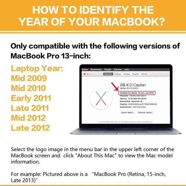 THE WRONG MODEL WILL NOT BE USED & HOW TO IDENTIFY THE YEAR OF YOUR LAPTOP -- There are three series, namely MacBook, MacBook Air, and MacBook Pro, which come in different sizes. Please first clarify which series and size your laptop belongs to. Select the logo image in the menu bar in the upper left corner of the MacBook screen and click " About This Mac" to view the Mac model information. Only compatible with