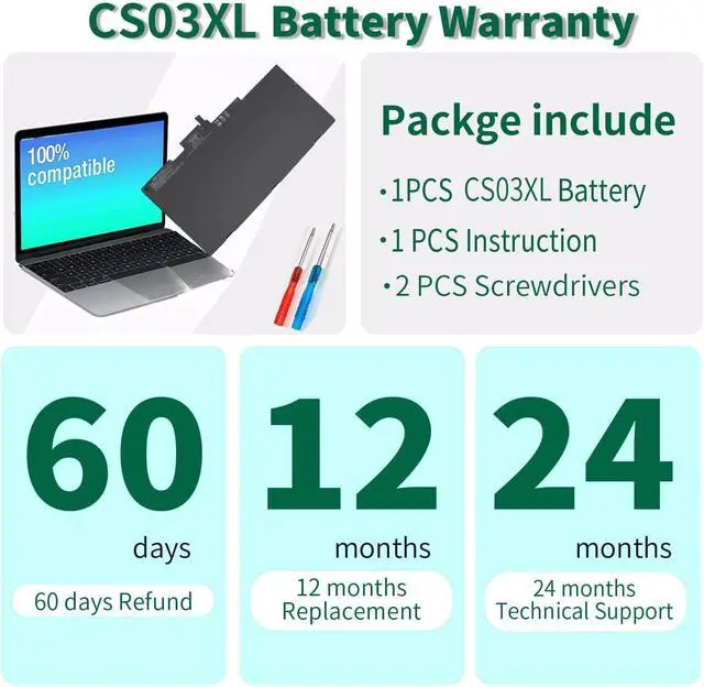 What You Get: CS03XL Battery, 2 Screwdrivers, User Manual for HP Elitebook 840 G3 Battery. We offer a 60-day return policy. For assistance with the Elitebook 840 G3 Battery, please visit our product detail page