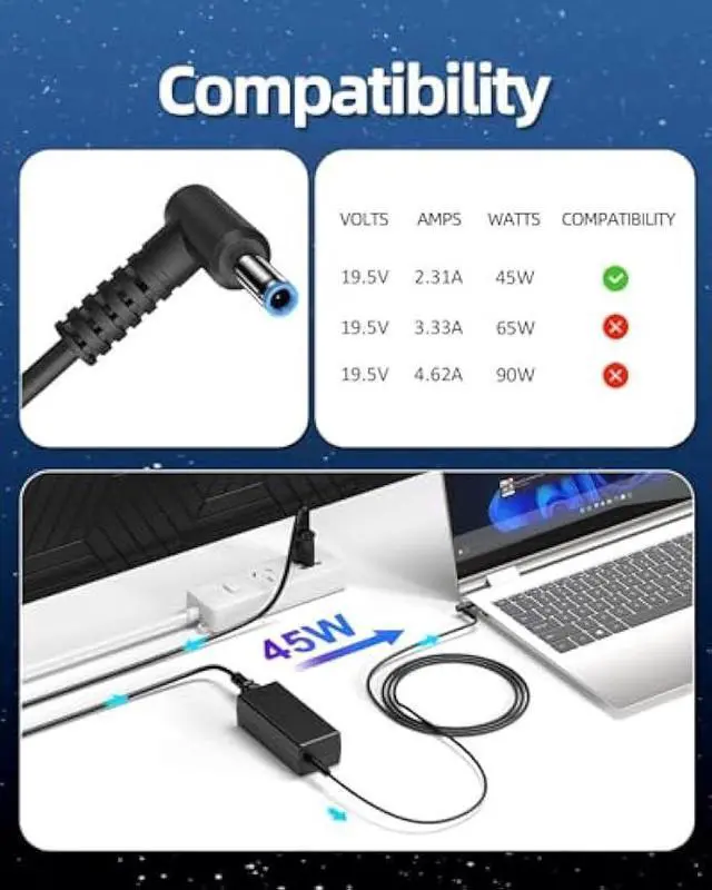 Compatibility with ALL HP laptops ( 19.5V 2.31A 45W, BLUE tip connector), fit for 15 Notebook, pavilion x360, stream, Spectre x360, EliteBook, Chromebook laptops with BLUE tip power connector.