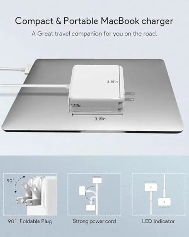 Portable SizeThe size of mac book charger is 3.15 * 3.15 * 1.10 ''. This mini cube design can greatly help whether storage or travel. The color of the LED indicator located at the head of the connector can let you know the charging status conveniently: amber means charging, green means fully charged.