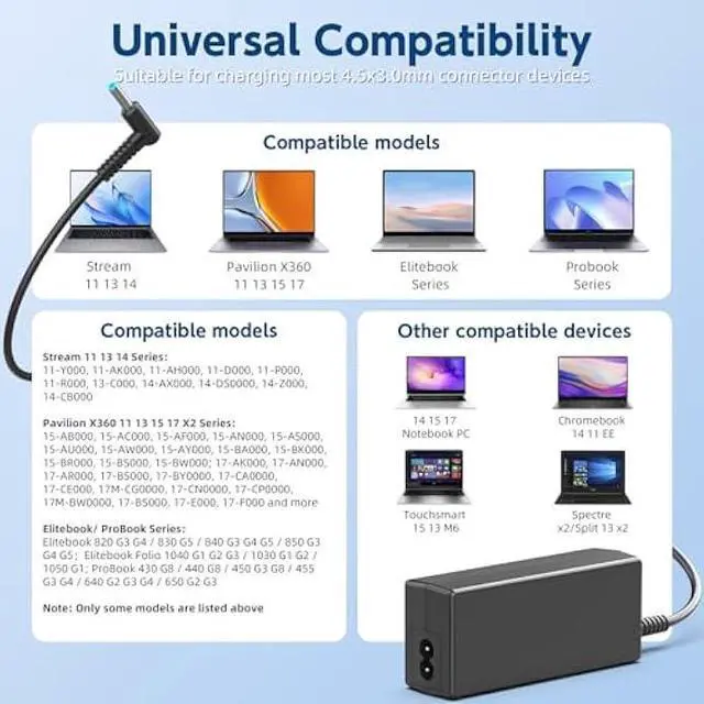 ROLADA Power Cord Compatible with Elitebook/ ProBook/ Envy: Replacement power adapter for Elitebook 820 G3 G4 / 830 G5 / 840 G3 G4 G5 / 850 G3 G4 G5Elitebook Folio 1040 G1 G2 G3 / 1030 G1 G2 / 1050 G1; ProBook 430 G8 / 440 G8 / 450 G3 G8 / 455 G3 G4 / 640 G2 G3 G4 / 650 G2 G3; Fit for Envy X360 13 15 17 15t 15m 17m Laptop