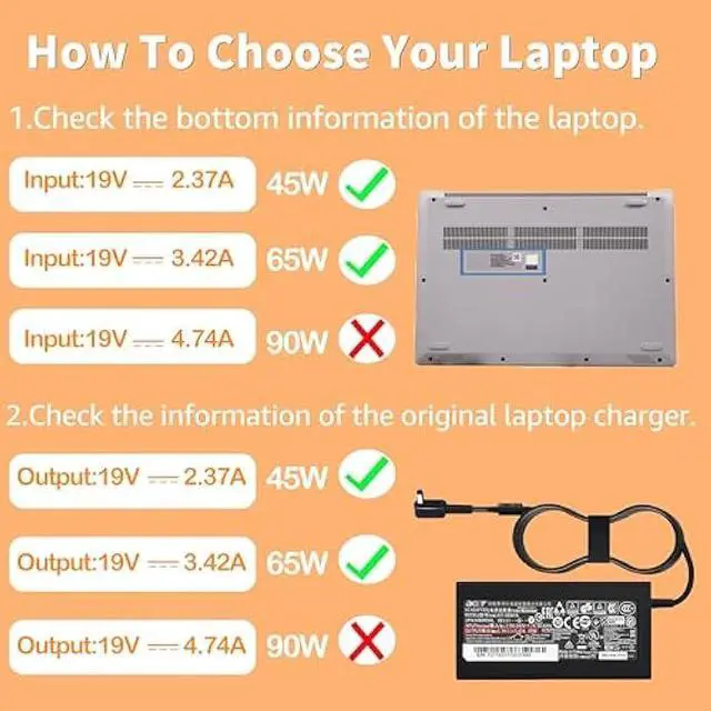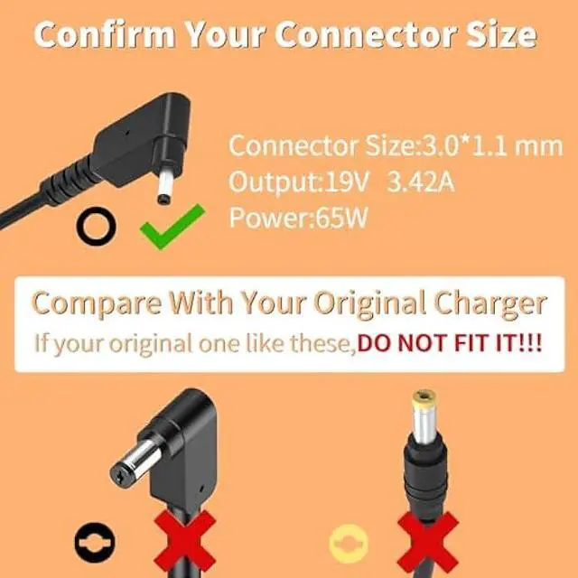 For Acer Laptop Charger Replacement19V 3.42A 65W replacement for acer aspire charger is fit for 19V 2.37A 45W/19V 2.15 A 40W whose connector size 3.0 * 1.1 mm. (Please refer to the picture to comfirm your connector size before purchase)