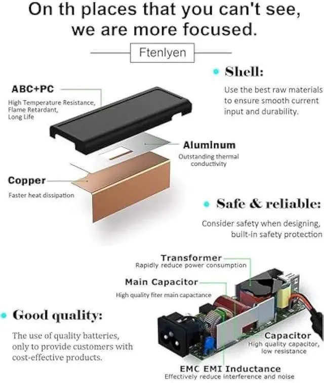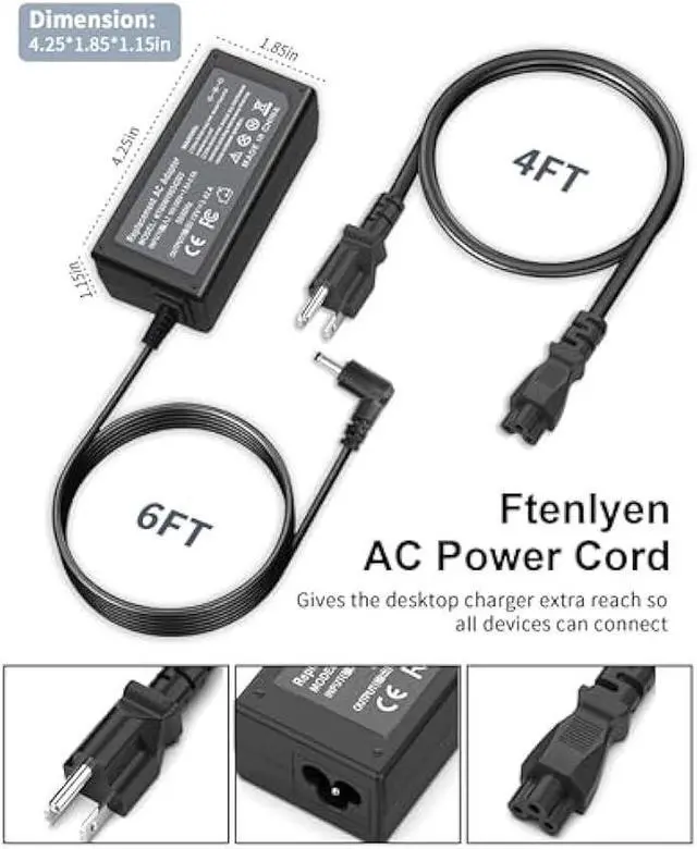 size: 3.0 x 1.1 mm, Output: 19V 3.42A 65W (Also Compatible with 19V 2.37A 45W), Input: 100-240V 50-60Hz. This charger is made by high-quality hardware and copper core wire, strict quality control can protect your devices against excessive current, overheating, and overcharging. CE/FCC/ROHS safety certificate.