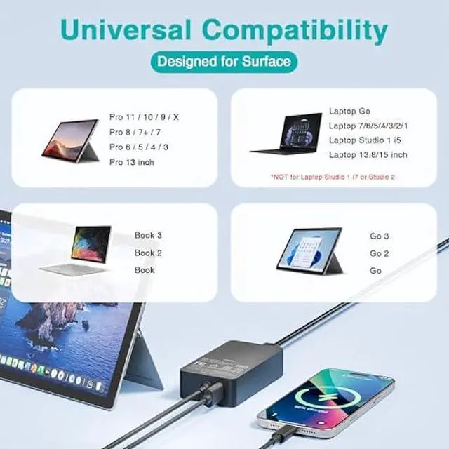 Widely Compatibility: Compatible with Microsoft Surface Pro Windows 11 AI+ PC 13 inch, Pro 11, 10, 9, 8, 7+, 7, 6, 5, 4, 3, X, Laptop Studio 1 i5, Laptop 13.8 inch, 15inch, Laptop 7, 6, 5, 4, 3, 2, 1, Book 3, 2, 1, Go 3, 2, 1