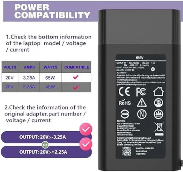 65W USB-C Laptop Charger Input100-240V 50-60Hz, Output5V/3A, 9V/3A, 15V/3A, 20V/ 3.25A. Connector SizeUSB Type C port, Watt: 65W( Compatible 45W USB-C Laptop Charger).