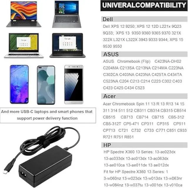 Compatible with: Dell Chromebook 3100 3500 3400 3300 3380 5300 5400 5500 7200 7300 7400 7486 5190 2-in-1 P28T P29T P30T P86F P99G P100G P101G P110G P111G P28T002 P29T001 P30T001 P101G001 2-in-1 Type C Laptop Charger Power Supply Cord.