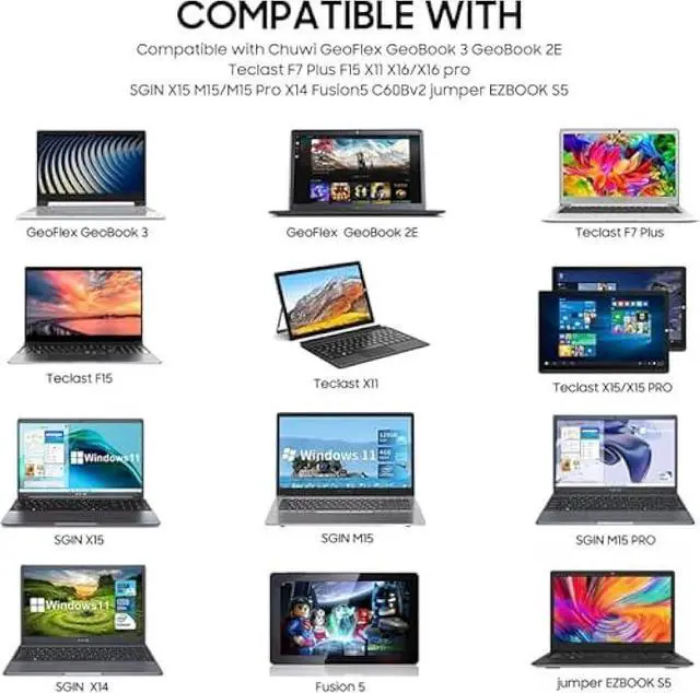 Compatibility Compatible with GeoBook 1, GeoBook 1M, GeoFlex / TREKSTOR PRIMEBOOK C13 C11 / Teclast F6 F5 F5r F7 Pro; Chuwi HeroBook ubook AeroBook LapBook SE Trekstor Surfbook Primetab Yourbook; Fusion5 14.1 inch A90B+ Pro / Teclast F6 F5 F5r F7 Pro /XIDU PhilPad PhilBook / LincPlus HKC Odys Winbook
