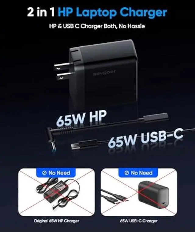 2-in-1 Charging Flexibility: This HP laptop charger features a smart convertible design for ultimate convenience. Attach the included 4.5 mm adapter cable to charge your HP laptop at full 65W power. Detach it to use the built-in USB-C port for charging phones or tablets. No more carrying multiple chargers or dealing with messy cables.