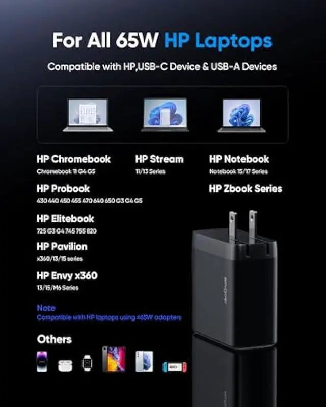 Widely Compatibility HP Charger: This 65W HP laptop charger delivers perfect power to 4.5 mm blue-tip HP devices including Pavilion, ENVY, ProBook, EliteBook and Chromebook models (20V/ 3.3A ).