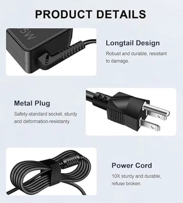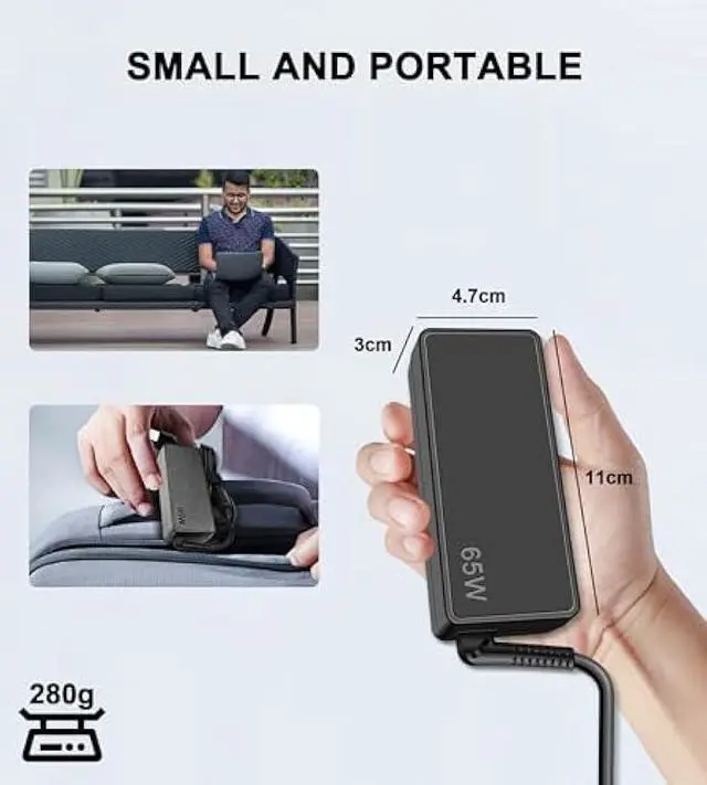 Portability: The 65W laptop charger can serve as a backup. It can be carried in a bag and used when going to work, on a business trip or traveling. Package Includes 1 x 65W Adapter, 1 x DC cable, and 1 x Instruction Manual