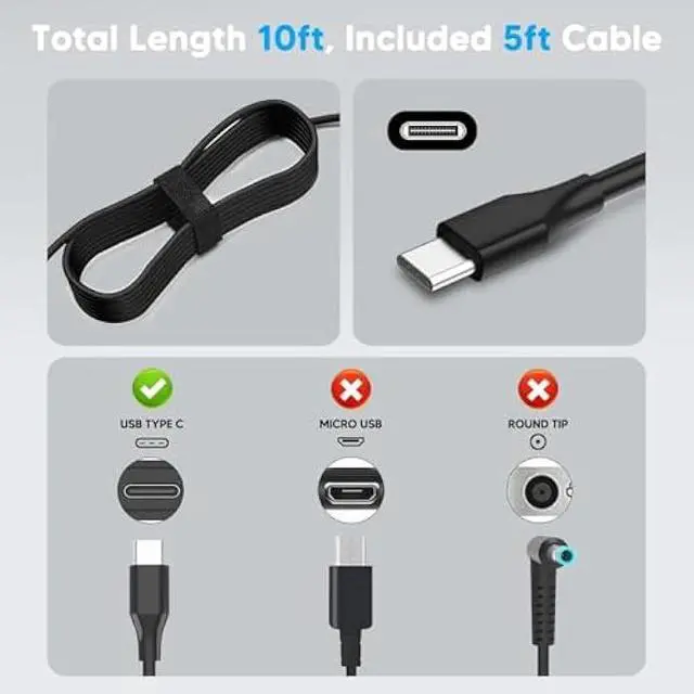 USB Type C Widely Adapter Power Cord for Dell XPS 12 (9250), XPS 13 (9365) 2-in-1, 13 9315, XPS 13 9300, 13 (9310), 13 (9310) 2-in-1, 13 9305, 13 Plus 9320, 13 9315 2-in-1, Dell Chromebook 13 (3380), 7486 2-in-1, 3400, 3100, 3100 2-in-1, 3110, 3110 2-in-1