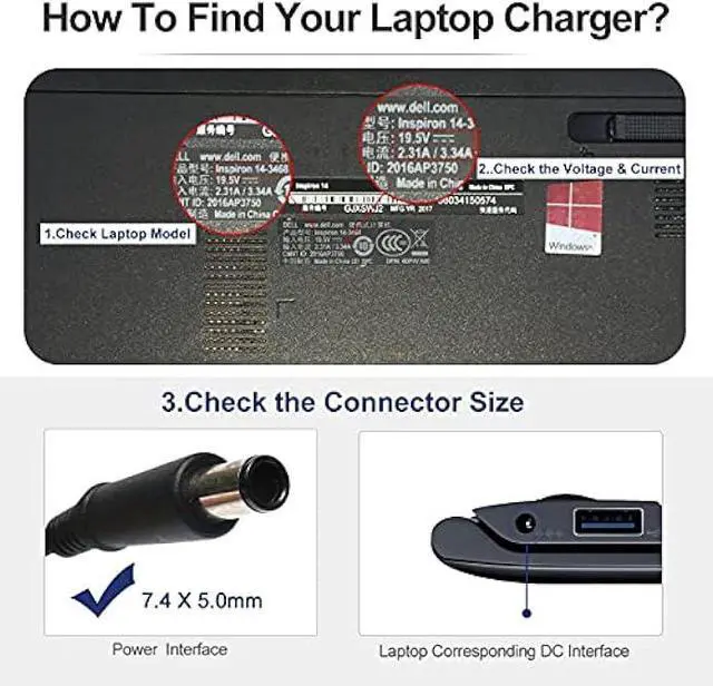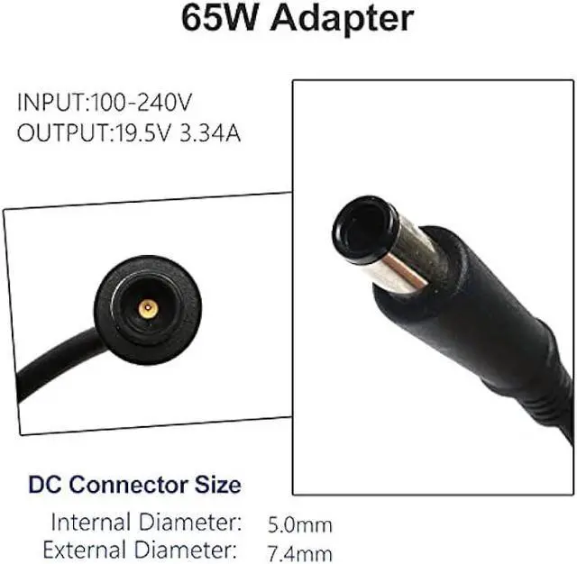 Input Volt Range: 100-240V Connector: 7.4 x 5.0 mm Output Max - 19.5V 3.34A 65W Black Package Includes: 1 X Ac Adapter 65W, 1 X Power Cord for Laptop, Outlet: 3-prong (Us plug)