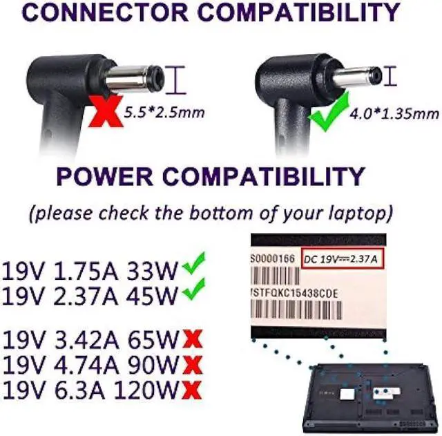 Output: 19V 1.75A - 2.37A 45W/33W; LAP POW Foldable AC adapter connector size: 4.0 mm * 1.35 mm;
