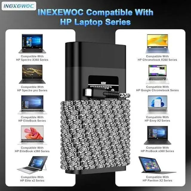 INEXEWOC New Slim 65W USB C Charger Compatible with HP ChromebookCompatible with HP Chromebook X360 14-CA 14C-CA 14A-NA 14B-CA 11-AE 11A-NB 14-DA 15-DB Series; Chromebook 13 G1/ 14A G5/ 14 G3/ 14 G5/ 14 G6/ 11 G4 EE/ 11 11A G6 EE/ 11 G7 EE/ 11 11A G8 EE/ X360 11 G1 EE/ x360 11 G2 EE/ 11mk G9 EE/ 11-AE 11A-NB 12B-CA