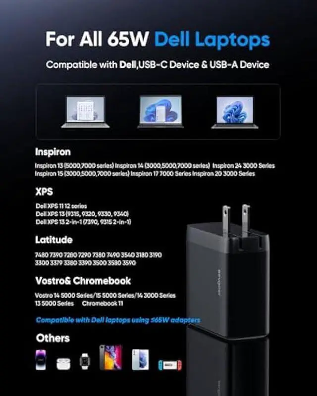 2-in-1 Dell Laptop & USB-C Charger: Switch between charging your Dell laptop(XPS/Inspiron/Latitude) and USB-C devices with one compact charger. Includes a detachable Dell charging adapter ( 4.5 *3mm charging adapter and 7.5 *3mm charging adapter, - fits most Dell 65W models ) for secure laptop charging and a 65W USB-C port for phones/tablets. No extra adapters needed - perfect for travel.