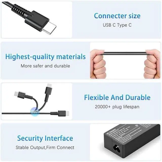 Input: 100-240V 50-60Hz, Output: 5V/3A 9V/3A 10V/5A 12V/5A 15V/5A 18V/5A 20V/5A, Connector: USB-C; Compatible with 100W 90W 65W 45W Devices.