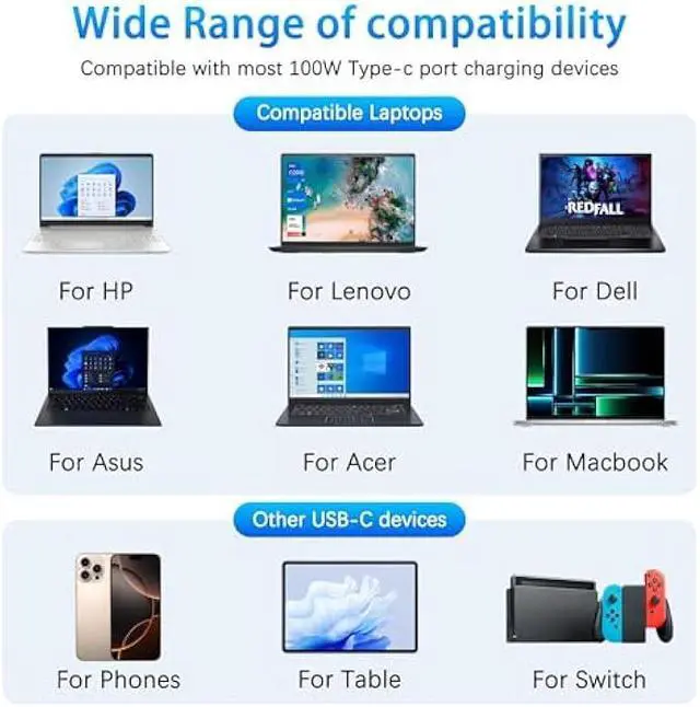 FJEZCHN 100w USB C laptop charger compatible with All the USB C Devices, This 100W USB laptop charger has passed CE, FCC, ROHS safety certificates, with over-current, over-voltage, overheating and short-circuit protections to ensure that you can use it with peace of mind. Meanwhile, the high power of 100W ensures that your laptop can be used normally even under high load operation