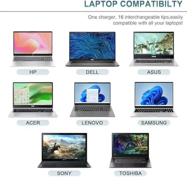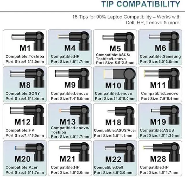 Wide Compatibility - This universal adapter includes 16 interchangeable tips, compatible with most laptops, ultrabooks, and Chromebooks. Compatbile with popular brands like Dell, HP, Acer, Asus, Lenovo, IBM, Toshiba, Samsung, Sony, Fujitsu, and Gateway. As long as the connector matches one of the included tips, it will work perfectly.