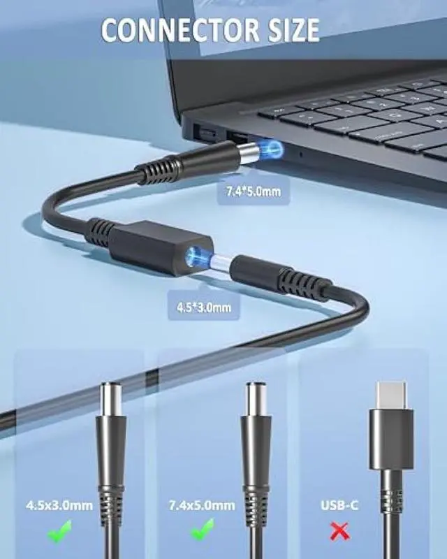 Connector Size: 4.5 mm x 3.0 mm, Comes with a 7.4 mm x 5.0 mm Connector Converter Cable; 100% New 90W Ac Adapter Power Cord.