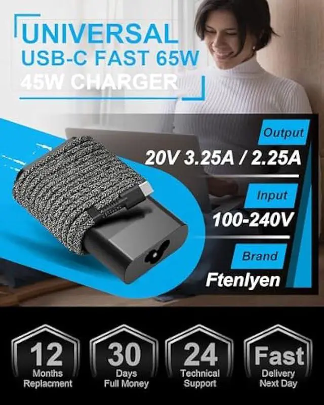 Size: Type USB C tip, Watt: 65W (Fit 45W Laptop Charger USB C).