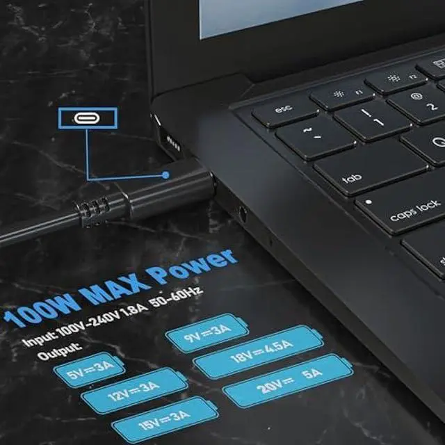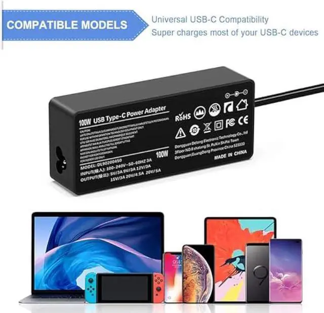 length: 9.8, Output: 5V 3A, 9V 3A, 12V 3A, 15V 3A, 18V 3A, 20V 4.5A, 20V 5A
