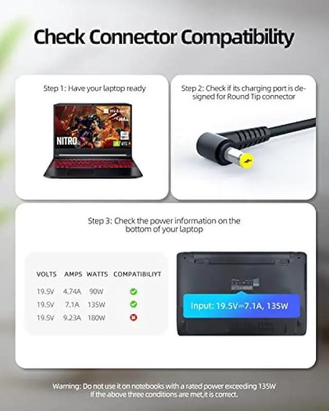 Superb CompatibilityCompatible with Acer Nitro 5 Gaming Series LaptopReplacement for Acer Nitro 5 AN515-55 AN515-54 AN515-57 AN515-51 AN515-53 515-44 AN515-43 N18C3 N18C4 AN517-51 N17C1 N20C1 Gaming Laptop. Only for amperage equal or less than 7.1A -135W.
