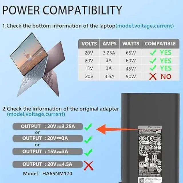 Compatible with Dell Computer Model: Fit for Dell XPS 13 charger 7390 9300 9305 9310 9315 9360 9365 9370 9380for Chromebook 11 3000 3110 3110 2-in-1 3100 3100 2-In-1 5190 5190 2-ln-1; Chromebook 13 3380; Chromebook 14 3400; Fit for Dell Inspiron 13 5000 5310 5320 5330 7000 7300 7306 2-in-1 Black; Inspiron 14 5000 5410 2-in-1 5482 2-in-1 5491 2-in-1 Inspiron 14 7000 7400 7415 7420 7425 7435 7440 7441 7490 Inspiron 15 5000 5582 2-in-1 5630 Inspiron 16 7000 7620 7630 7640 2-in-1