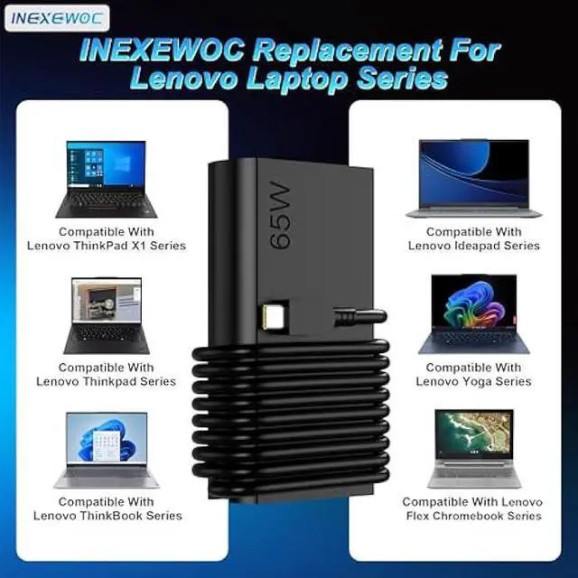 INEXEWOC New Slim 65W USB C Laptop Charger Compatible with Lenovo ThinkPad - Compatible with Lenovo Yoga S730 C930 C940 C740 730 730S 910 920 Series / Yoga 7i 9i 14 15 2 in 1 Laptop; for Lenovo Chromebook 100e 300e 500e C330 C340 S330 S340 S345 C630 Laptop