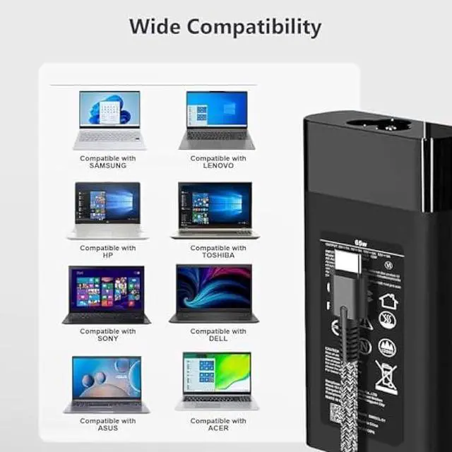Input: 100-240V~ 1.5A, 50-60Hz, Output: 5V 3A /9V 3A /12V 5A /15V 4.33A /20V 3.25A, MAX Power 65W (Compatible with 45W 65W HP Laptop Charger USB C)