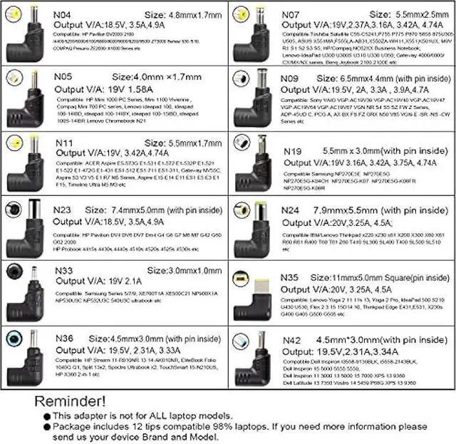 Wide output voltage DC 5-24V- Not for All Laptops. Each brand laptop has several different kinds of tips for different models. If you are not sure your laptop tip size, pls send your laptop brand and model number to us before buying, we will give Suggestions. Compatible for Lenovo 0C19880, ADLX45NLC3A, 36200246, 0B47030, ADLX45NDC3, ADLX45NDC3A, ADLX45NLC3, ADLX45NLC2A, 45N0293, 45N0294, 45N0295, 45N0296, 36200280, 36200245, 45N0289, 45N0290, PA-1450-12, 45N0290, 45N0292, 45N0298, 45N0300 ect.