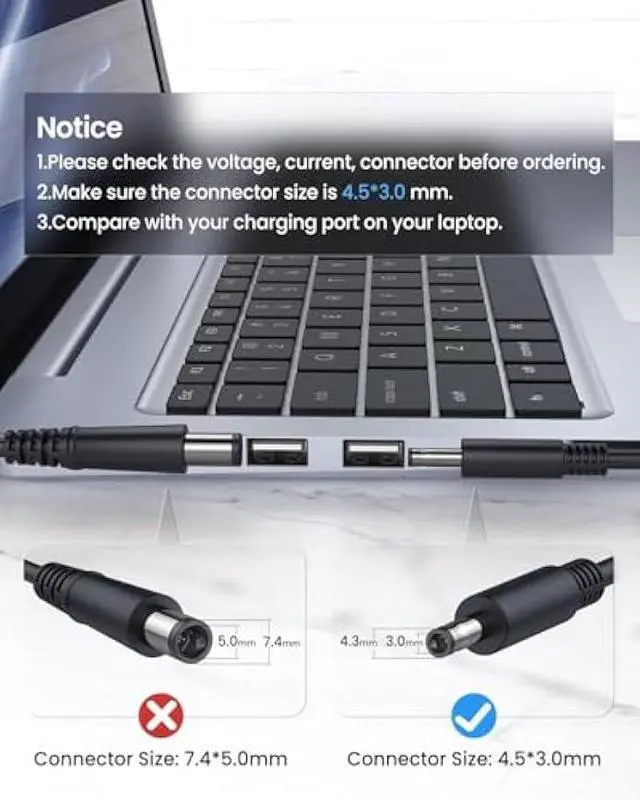 SpecificationsConnector: 4.5 mm * 3.0 mm Round tip (Be Carefully!!! Check Connector Picture! Please Check!!! ) Input100-240V~50-60Hz 1.8A, Watt: 65.0W (Compatible with 45 Watt ) Output5V-3A 9V-3A 12V- 3A 15V-3A 18V- 2.5A 20V- 3.25A