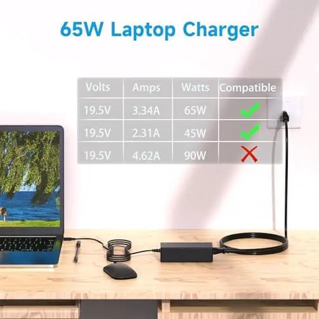 Output: 19.5V, 3.34A, 65W (compatible with 19.5V, 2.31A, 45W), Comes with 2 Connectors 4.5 x 3.0 mm and 7.4 x 5.0 mm.