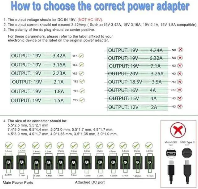 1. This 19V 3.42A power supply adapter is only compatible with electronic devices with an operating voltage of DC IN 19V, an operating current of 0.1A ~ 3.42A, and a maximum power of up to 65W. such as DC 19V 3.42A, 3.16A, 2.1A, 1.5A.