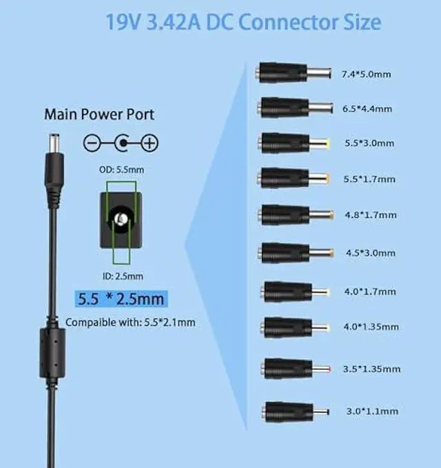 [Package List: ] 1*19V 3.42A ac dc power supply adapter, 1*us plug ac power cord, 10* replaces dc connector. (Additional DC terminals